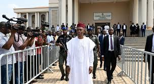 He arrived at the court on Tuesday following his release from the custody of the Independent Corrupt Practices and Other Related Offences Commission (ICPC) for his mother’s burial.